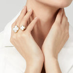 The Twin Alhambra Ring pairs two iconic clover motifs in lustrous mother-of-pearl, framed in radiant gold. A graceful symbol of luck and timeless beauty, designed to shine from every angle.
