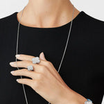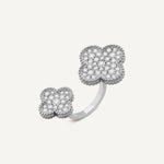 The Twin Alhambra Diamond Ring features a mirrored pair of clover-inspired motifs, each outlined with radiant diamonds. Symbolizing harmony and elegance, it's a graceful celebration of balance and brilliance.